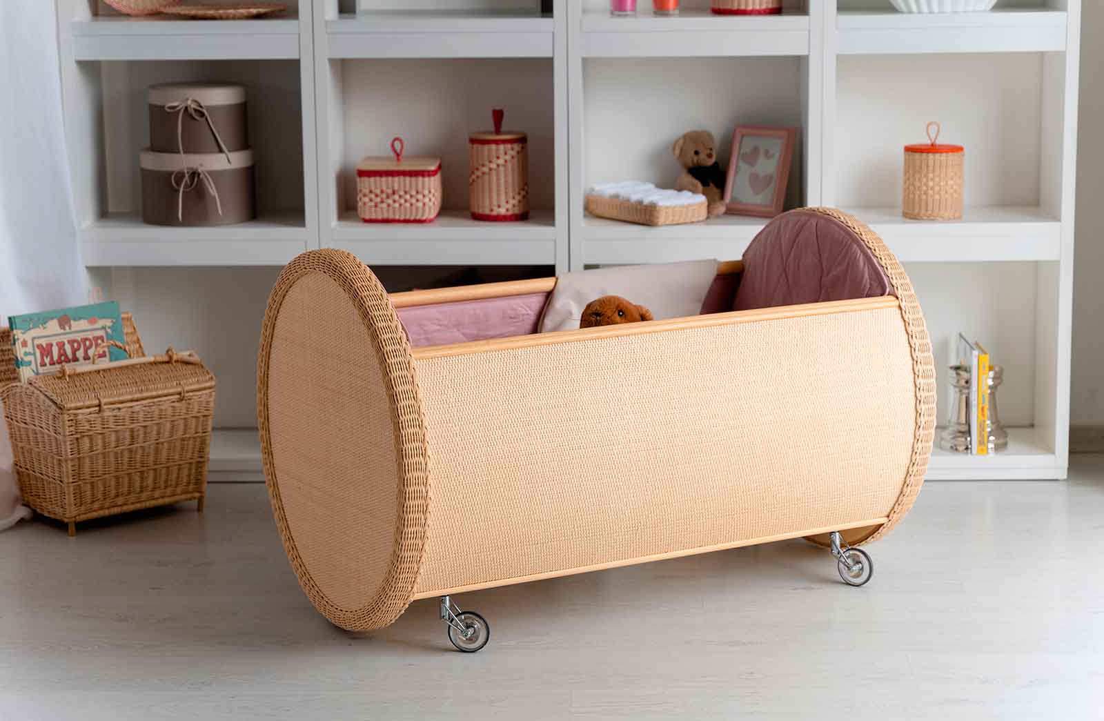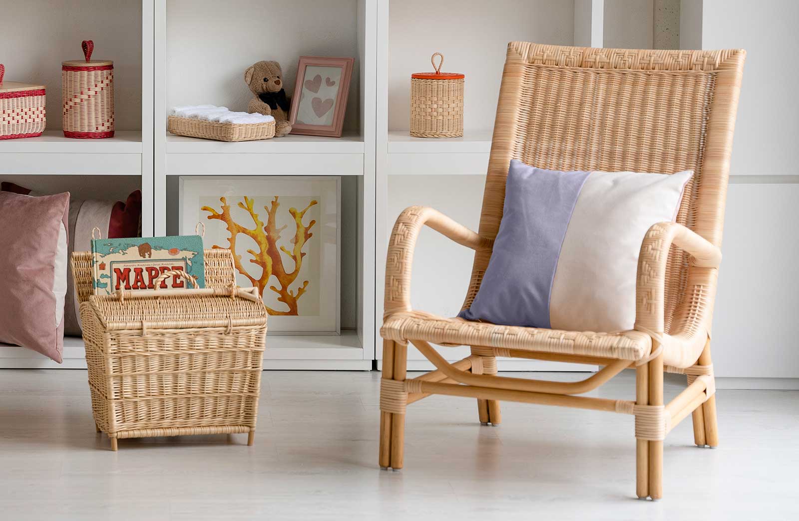 Nel nostro laboratorio lavoriamo principalmente il midollino, un materiale derivato dal giunco, insieme a tessuti biologici come il lino e il cotone. Utilizziamo anche rattan, vimini, corde e pelle. La nostra falegnameria dispone di una vasta selezione di legni pregiati, come teak golden burma, iroko, faggio e frassino, per le parti strutturali.