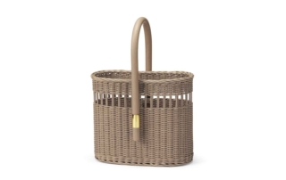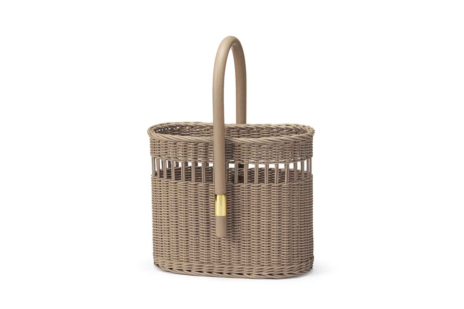 Portabottiglie in midollino intrecciato a mano e manico in rattan curvato a caldo.