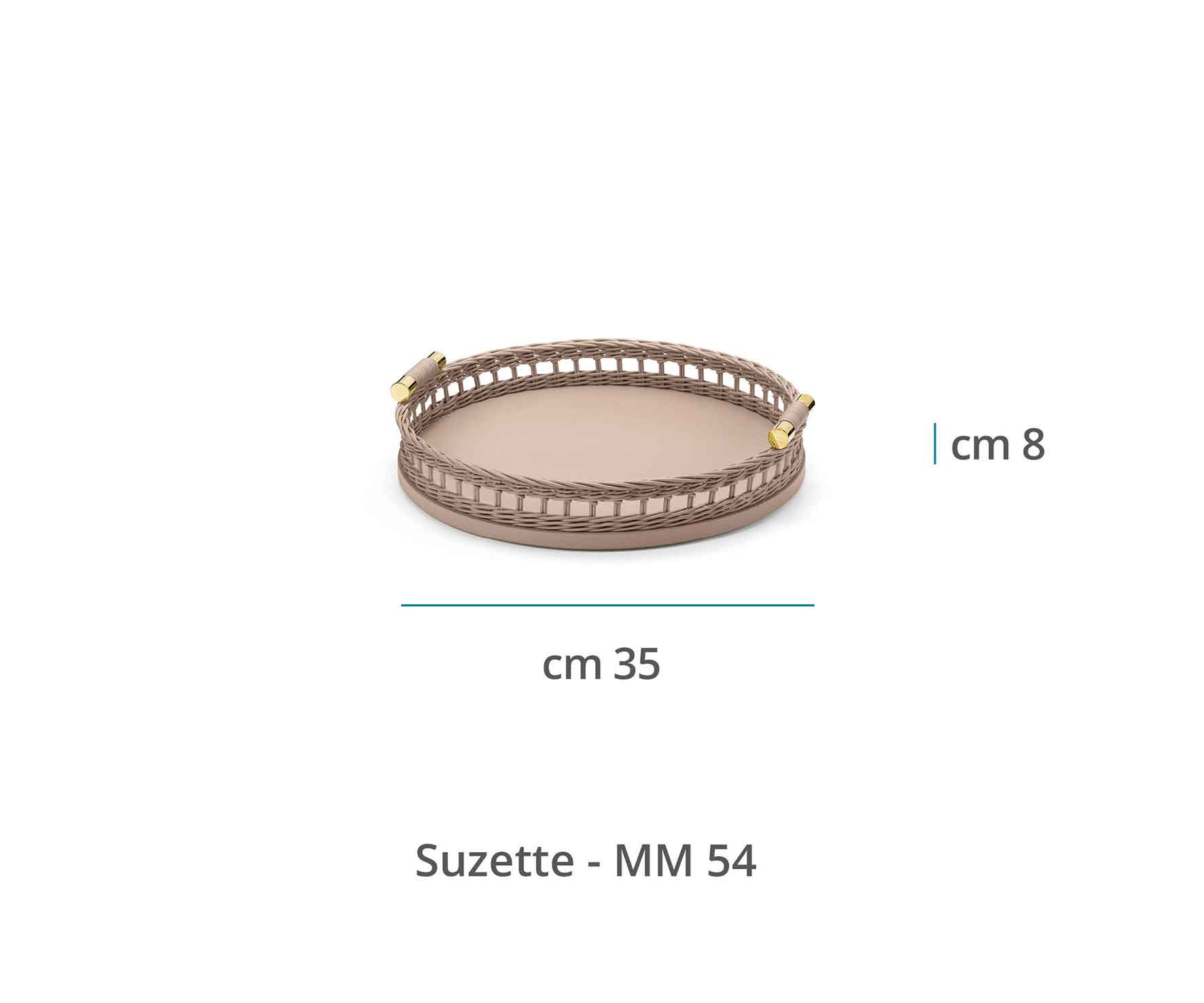 Vassoio tondo intrecciato in midollino, fondo in legno e manici in ottone lucido.