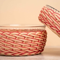 Cesto soufflè con intreccio paniere in midollino bicolore naturale e rosa geraneo. Completo di contenitore in vetro Pyrex.